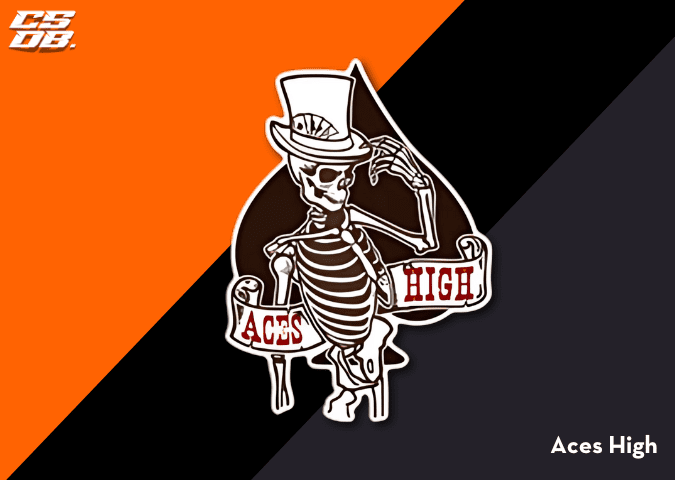 If you have played card games before, you know what ace means. In this design, Ace has a white skeleton man on him. The skeleton has a white fedora and tie. From a distance, you can see that the figure is a well-dressed businessman. In addition, there is the word “Aces High” in red in the middle of the figure.